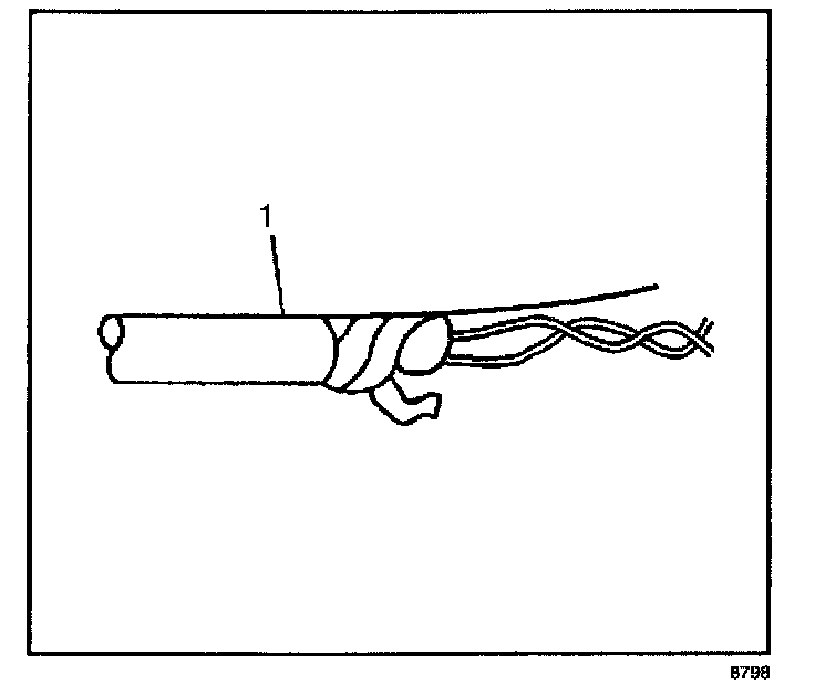 1. Remove the outer jacket (1). Use care not to cut into the drain wire of the mylar tape.