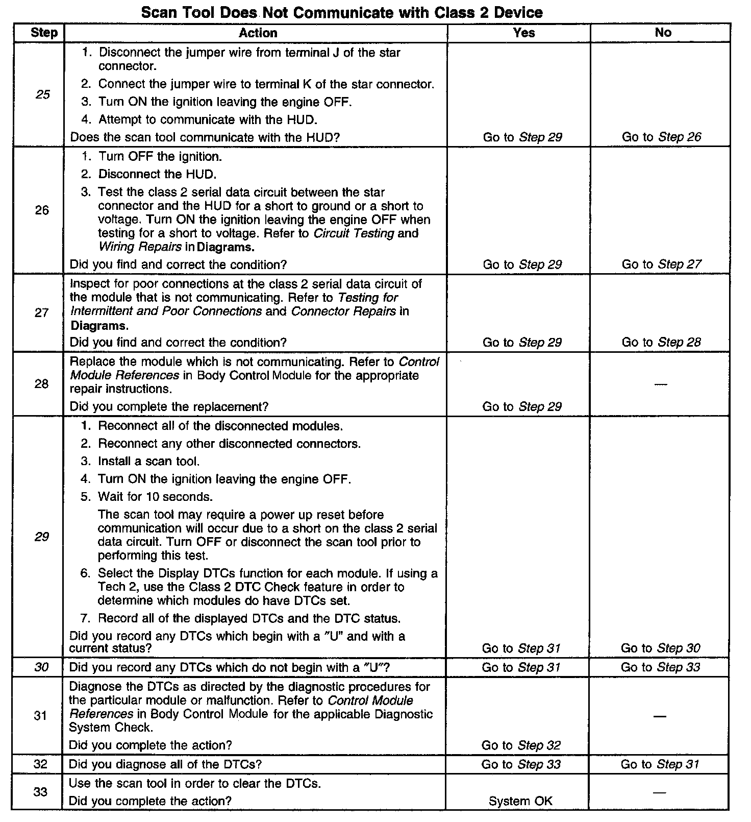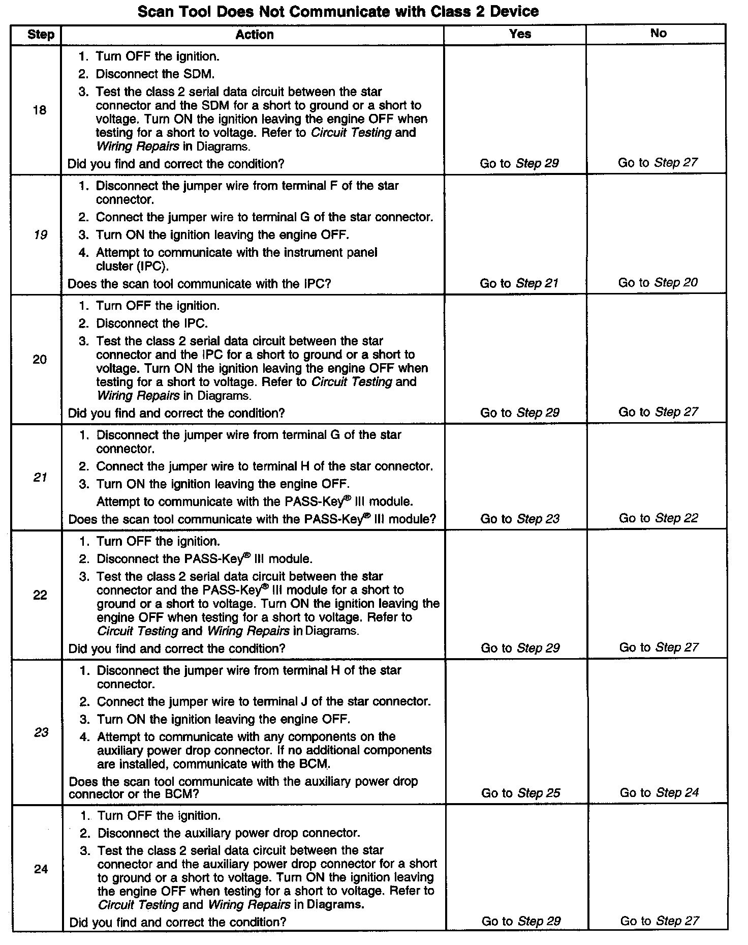 9. The class 2 serial data circuit is shorted to voltage or ground. The condition may be due to the wiring or due to a malfunction in one of the modules. When testing the wire for a short, make sure there is not a module connected to the wire being tested. This test isolates the BCM class 2 serial data circuit.