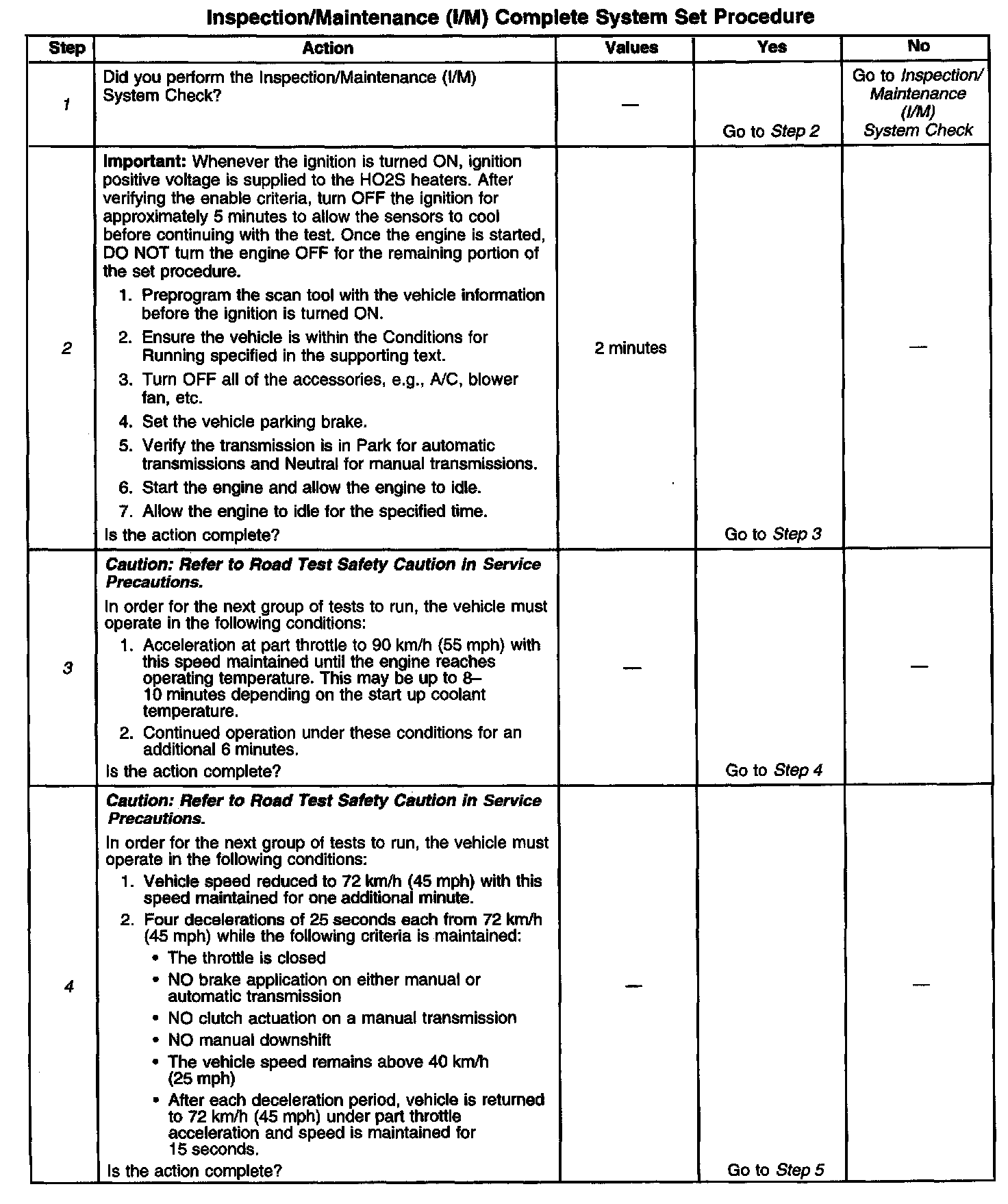 DESCRIPTIONThe purpose of the I/M Complete System Set Procedure is to satisfy the enable criteria necessary to execute all of the I/M readiness diagnostics, and complete the trips for those particular diagnostics. When all diagnostic tests are completed, the I/M System Status indicators are set to YES. Perform this test when more than one or all of the I/M System Status indicators are set to NO.