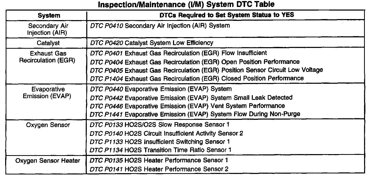 Inspection/Maintenance (I/M) System DTC Table: