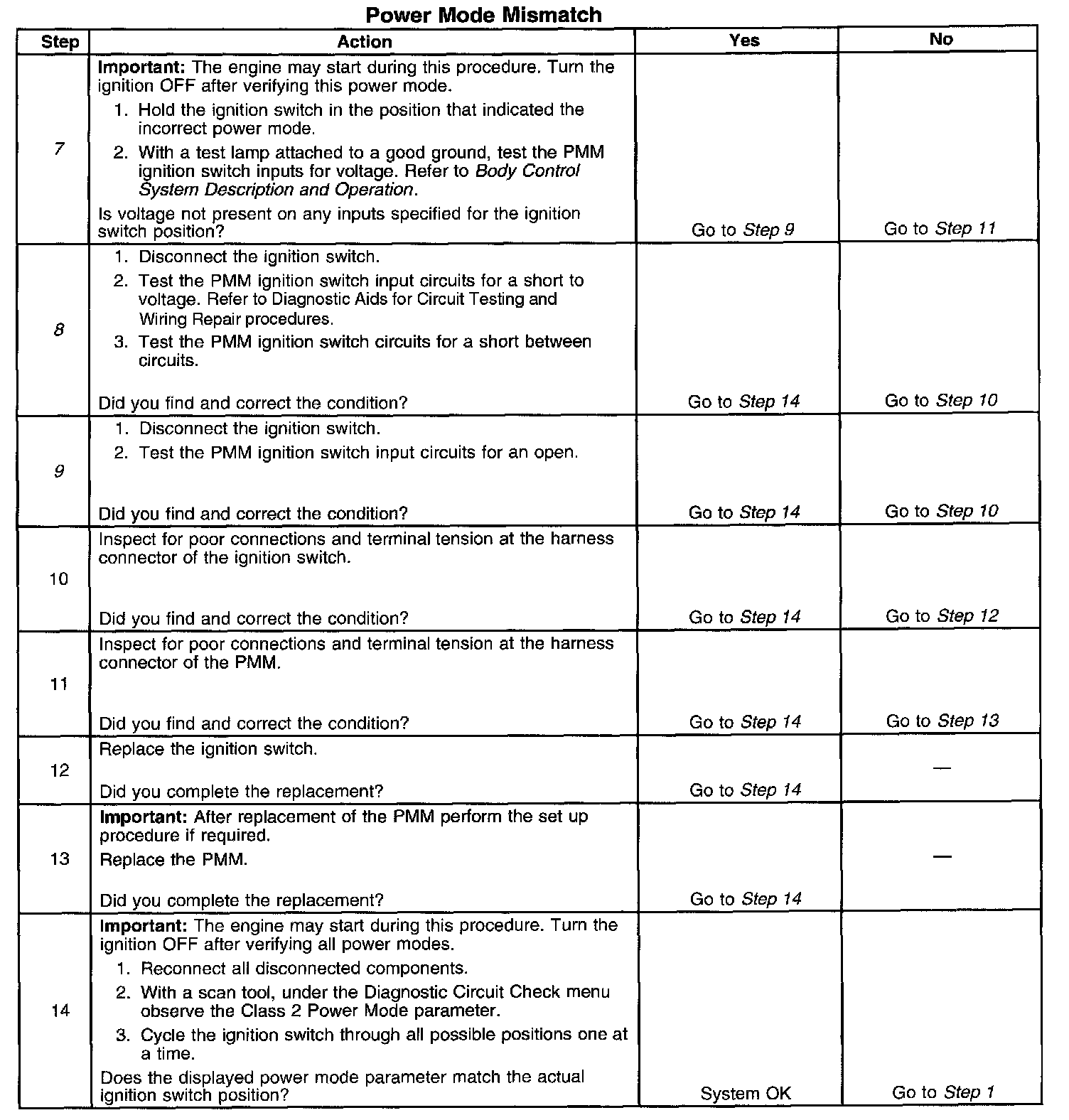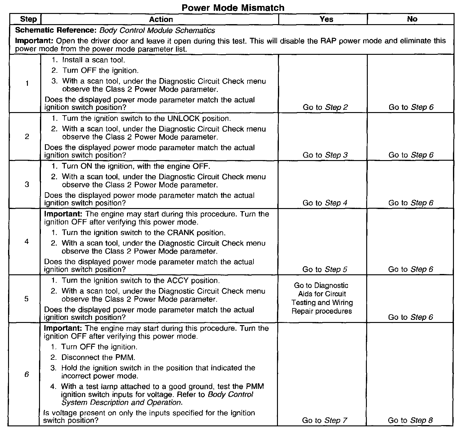 CIRCUIT DESCRIPTIONNormal vehicle class 2 communications and module operations will not begin until the system power mode has been identified. Discrete wires from the ignition switch contacts are monitored by the power mode master (PMM) module in order to determine the correct power mode. The PMM communicates the system power mode to all class 2 modules on the class 2 serial data line. Refer to Body Control System Description and Operation to identify which module is the PMM and the applicable power mode look up table.