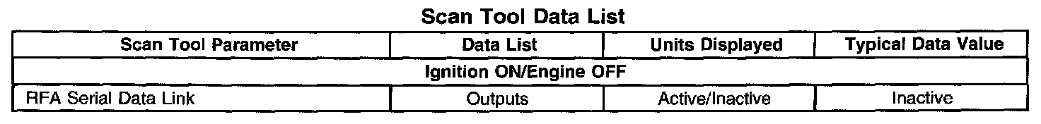 The keyless Entry Scan Tool Data List contains all of the keyless entry related parameters that are available on the scan tool. The parameters in the list are arranged in alphabetical order. The column, "Data List," indicates the location of the parameter within the scan tool menu selections. Use the keyless Entry Scan Tool Data List as directed by a diagnostic table or in order to supplement the diagnostic procedures. Begin all of the diagnostic procedures with Diagnostic System Check - Remote Keyless Entry.