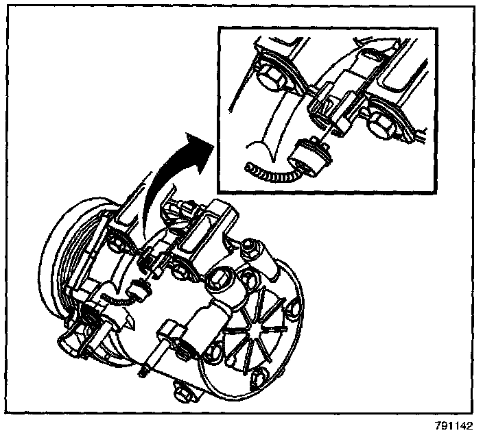 4. Release the drive belt tensioner. Remove the drive belt from the compressor pulley.