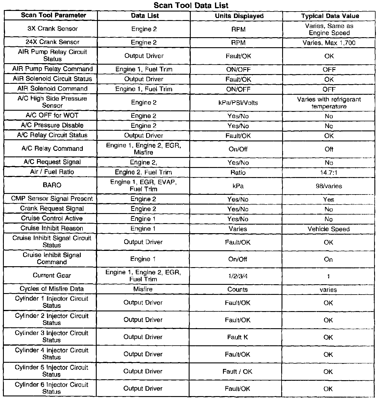 ^ Engine Data 1-Contains general information regarding fuel delivery, intake air control (IAC) position, heated oxygen sensor (HO2S) 1, HO2S 2, and other basic engine operating conditions.