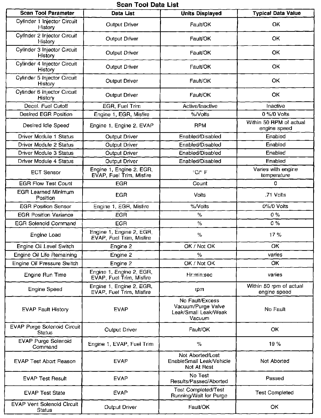 ^ Exhaust gas recirculation (EGR) Data-Contains information specific to the EGR system. This list displays parameters required to verify proper EGR system operation.