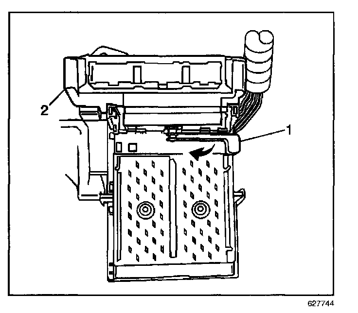 3. Rotate the BCM retaining lever (1) to release the BCM from the console accessory wiring junction block.