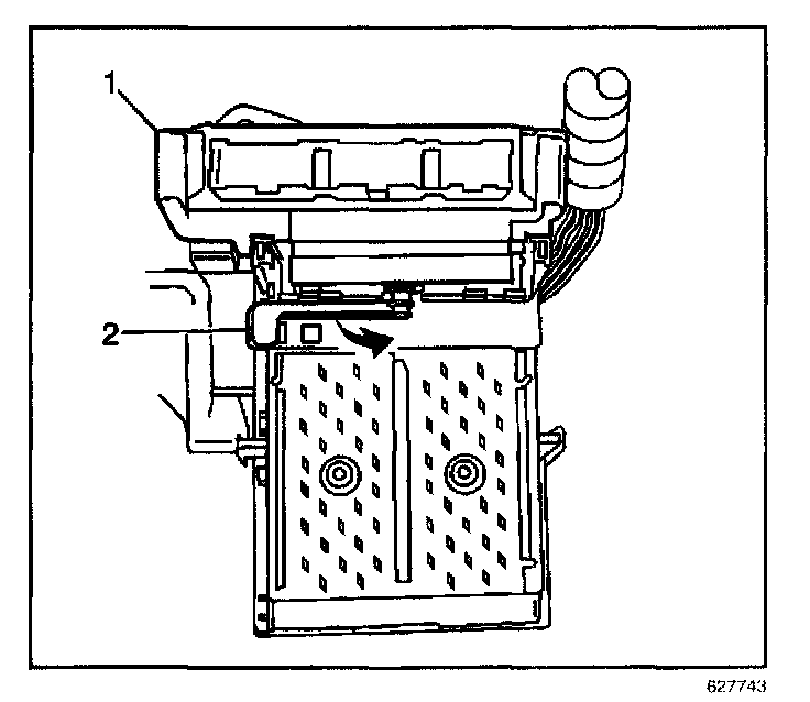 2. Rotate the BCM retaining lever (2) to secure the BCM to the console accessory wiring junction block.