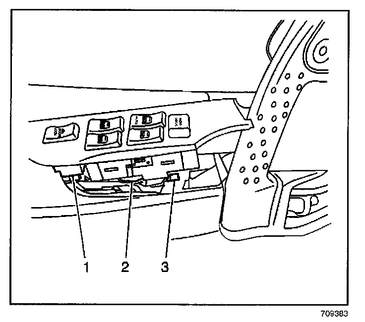 4. Remove the front door window control switch (2) from the front door window switch plate using a small flat-bladed tool.