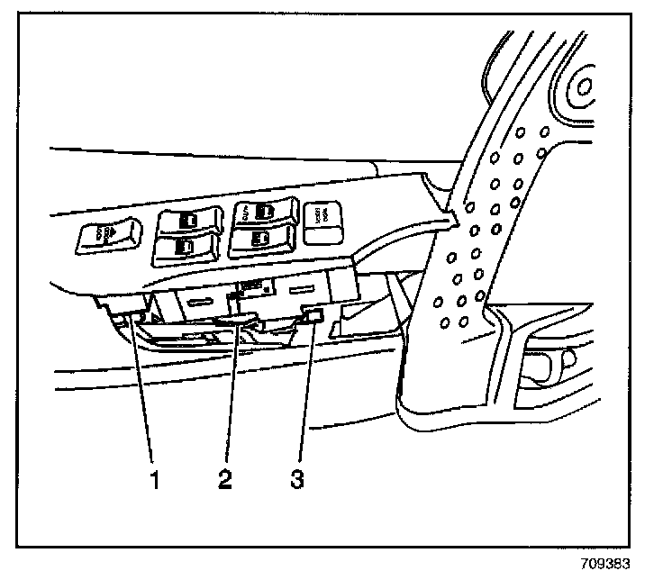 REMOVAL PROCEDURE1. Remove the front door lock switch plate from the front door trim panel using a small flat-bladed tool at the front of the power window control switch.
