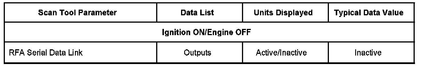 The Keyless Entry Scan Tool Data List contains all of the keyless entry related parameters that are available on the scan tool. The parameters in the list are arranged in alphabetical order. The column, Data List, indicates the location of the parameter within the scan tool menu selections. Use the Keyless Entry Scan Tool Data List as directed by a diagnostic table or in order to supplement the diagnostic procedures. Begin all of the diagnostic procedures with Diagnostic System Check - Remote Keyless Entry.