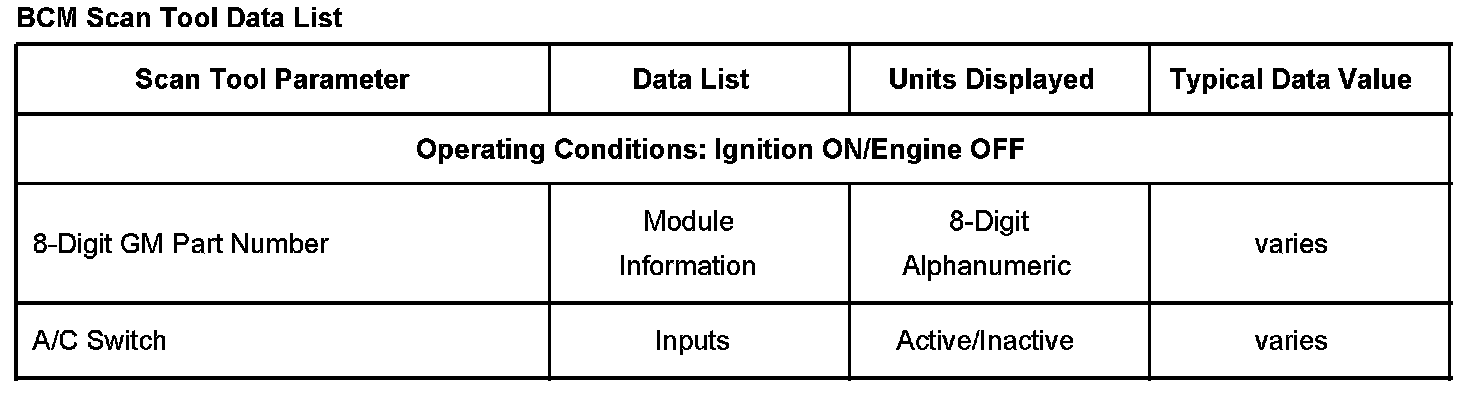 Scan Tool Data List - Body Control Module (BCM)