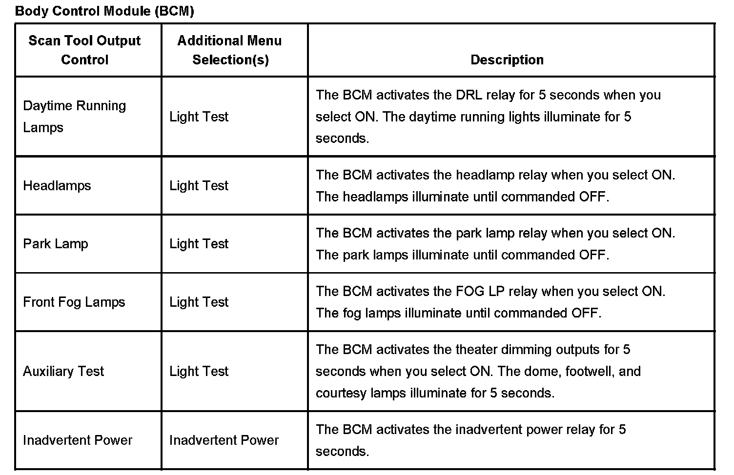 Body Control Module (BCM) Scan Tool Output Controls: