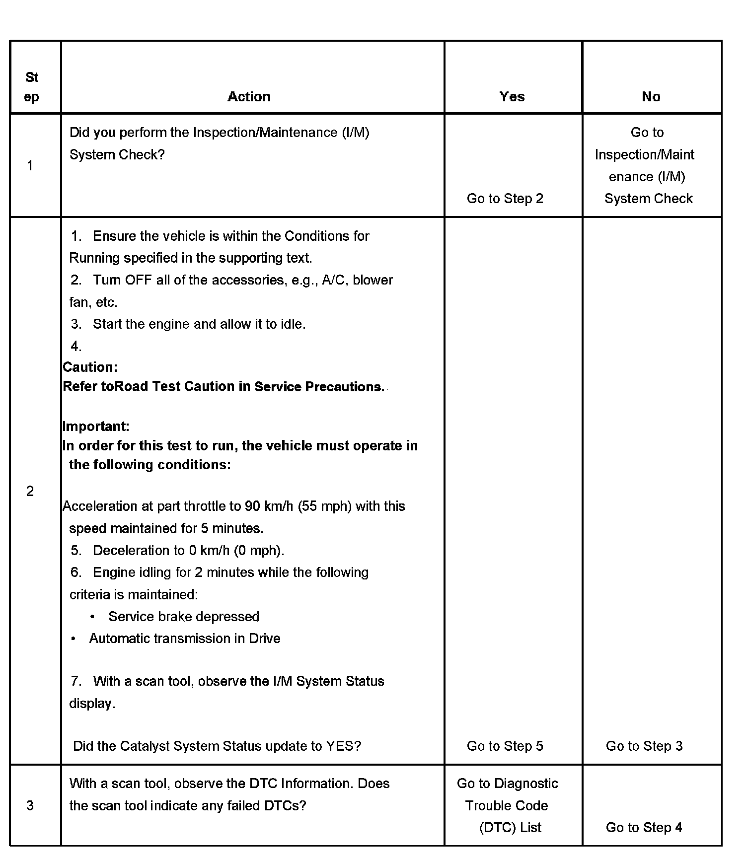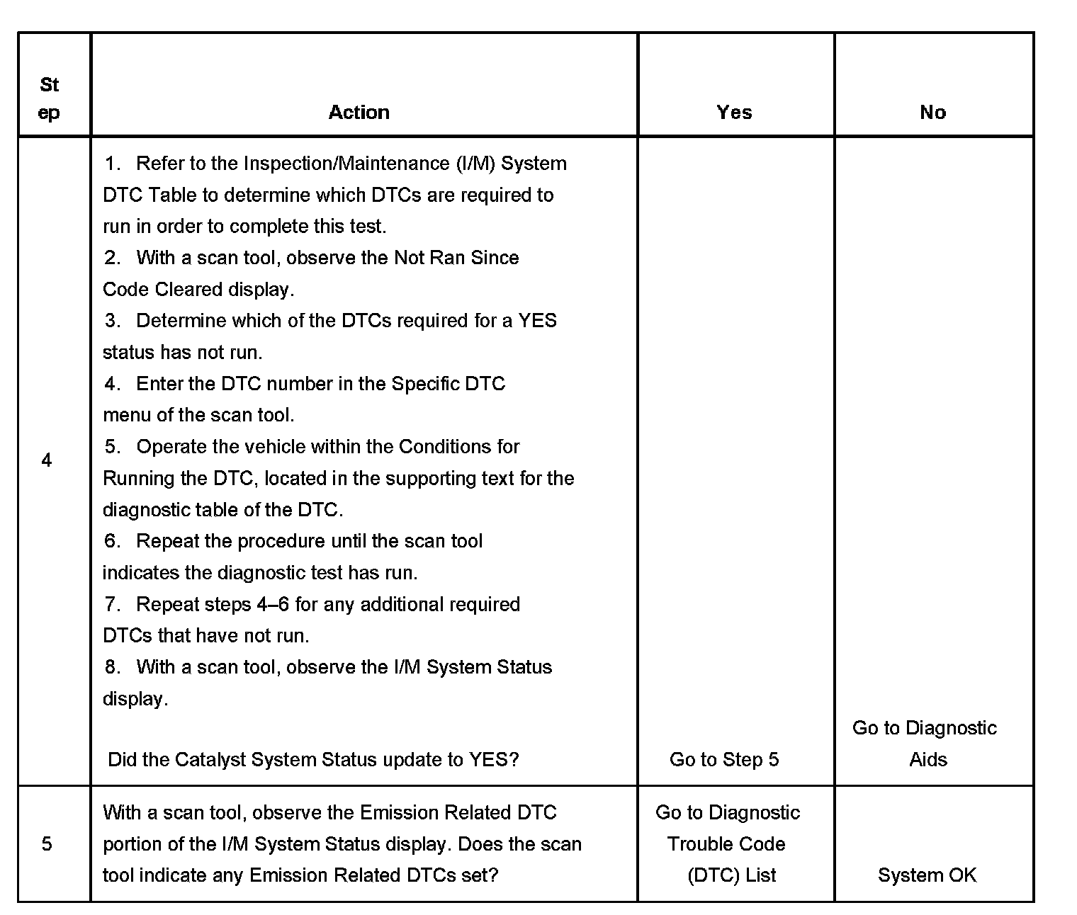 3. This step is to identify a first failure of a type B DTC. A DTC only appears on the I/M System Status display when it becomes a MIL illuminating DTC. This occurs on the second failure of a type B DTC. A first failure of a type B DTC will not allow the I/M System Status to update to YES. Refer to Diagnostic Aids.