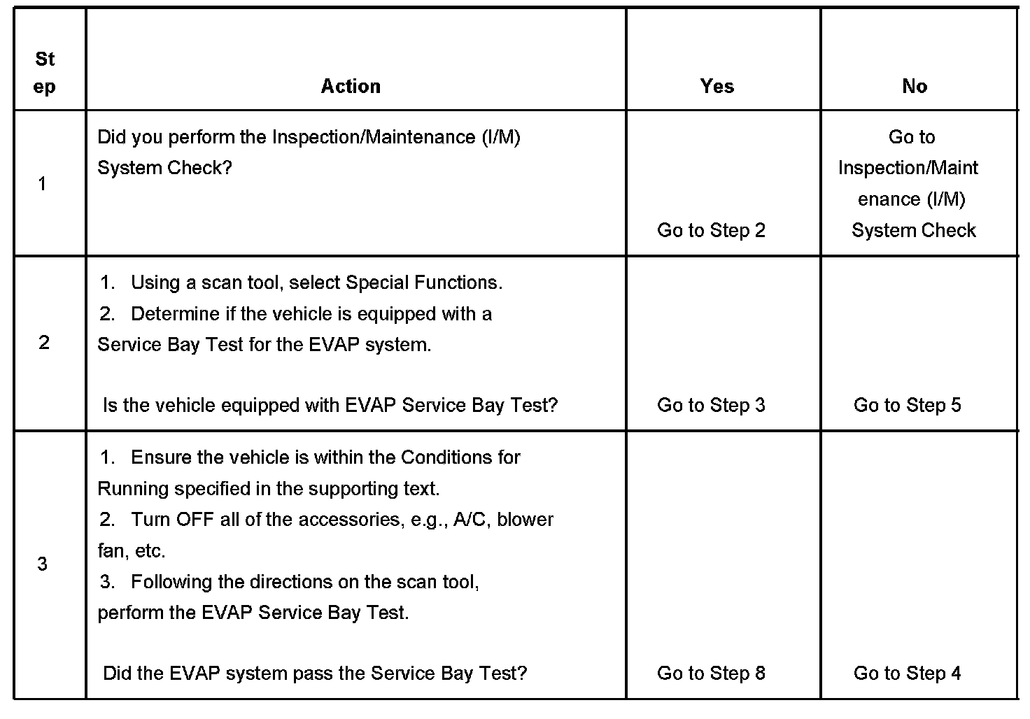 3. This step is to determine whether or not the EVAP System Test has passed. If the system is operating correctly, the scan tool indicates that the system has passed and the I/M System Status updates to YES. If the EVAP Service Bay Test aborts because of lost enable conditions, the test can be repeated once the enable criteria is met.