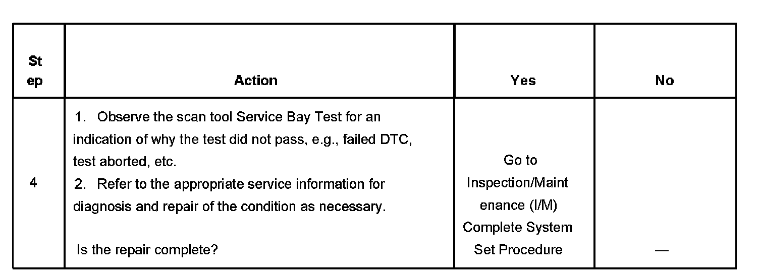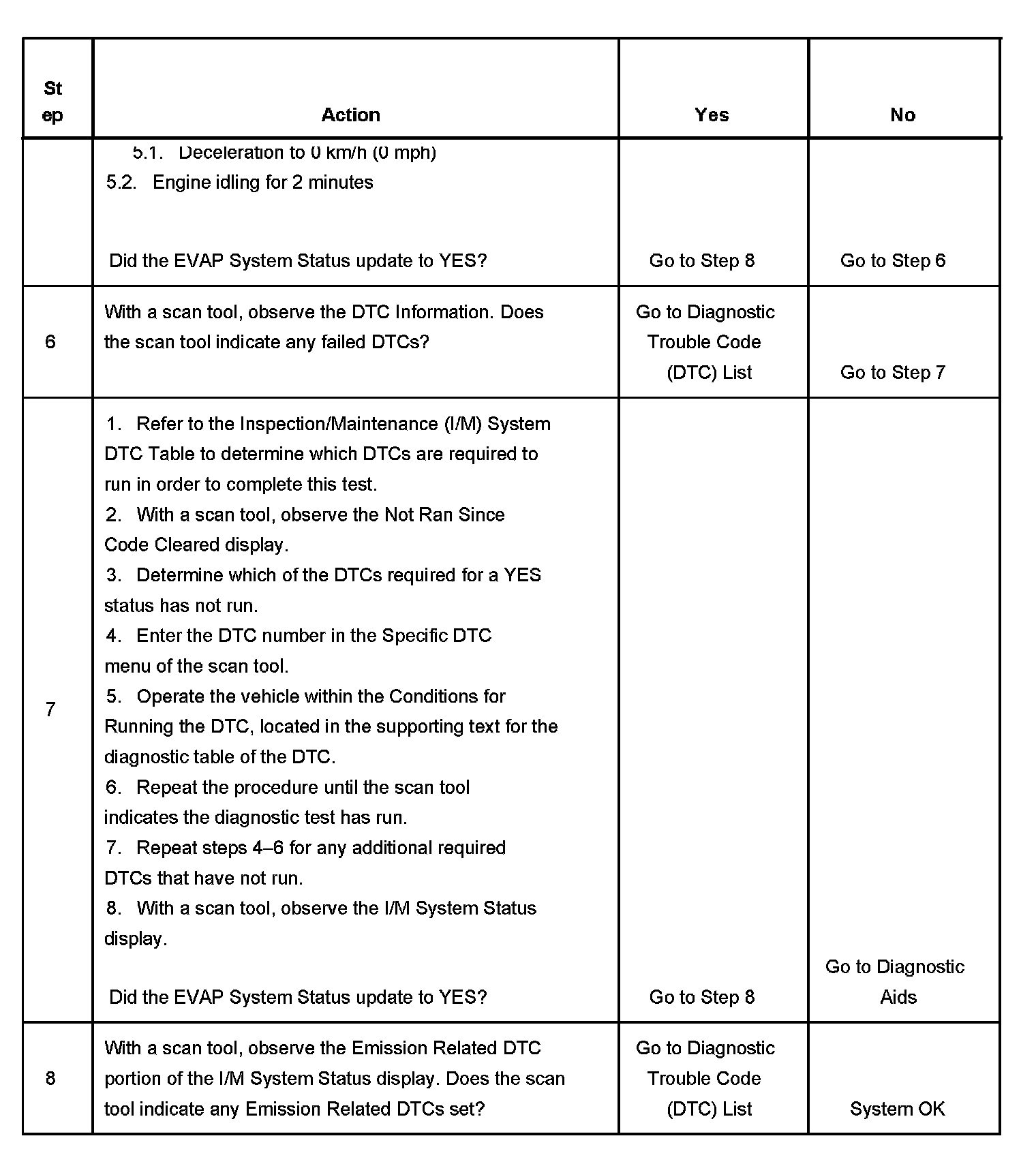 6. This step is to identify a first failure of a type B DTC. A DTC only appears on the I/M System Status display when it becomes a MIL illuminating DTC. This occurs on the second failure of a type B DTC. A first failure of a type B DTC will not allow the I/M System Status to update to YES. Refer to Diagnostic Aids.