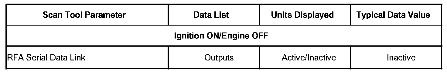 The Keyless Entry Scan Tool Data List contains all of the keyless entry related parameters that are available on the scan tool. The parameters in the list are arranged in alphabetical order. The column, "Data List," indicates the location of the parameter within the scan tool menu selections. Use the Keyless Entry Scan Tool Data List as directed by a diagnostic table or in order to supplement the diagnostic procedures. Begin all of the diagnostic procedures with Diagnostic System Check - Remote Keyless Entry.