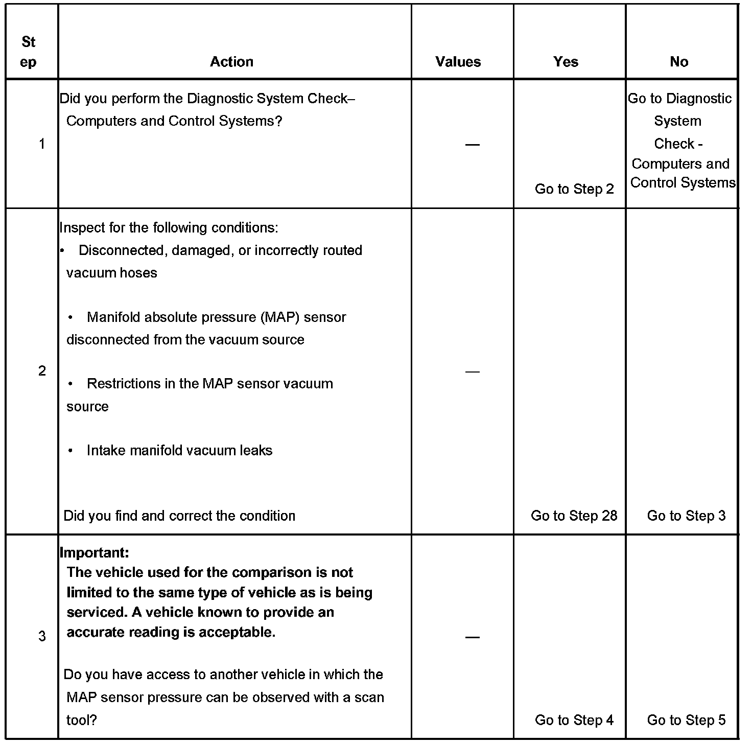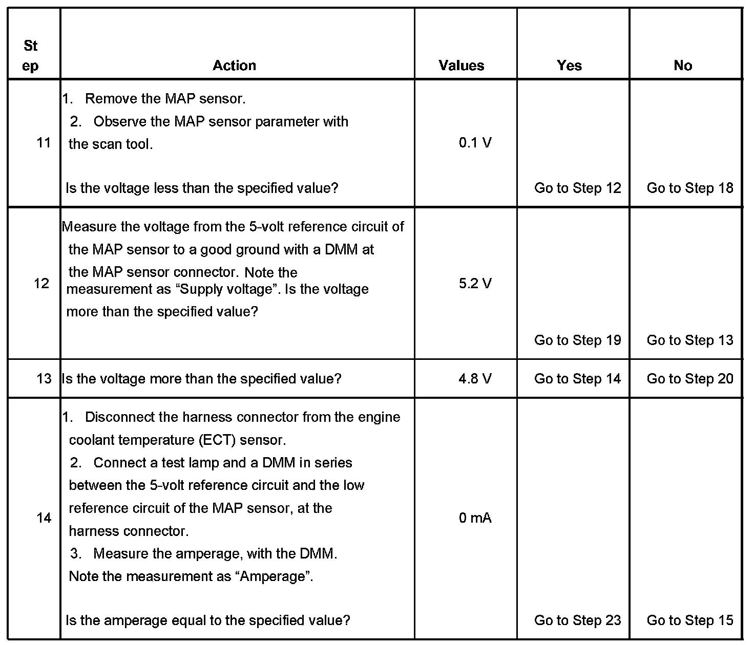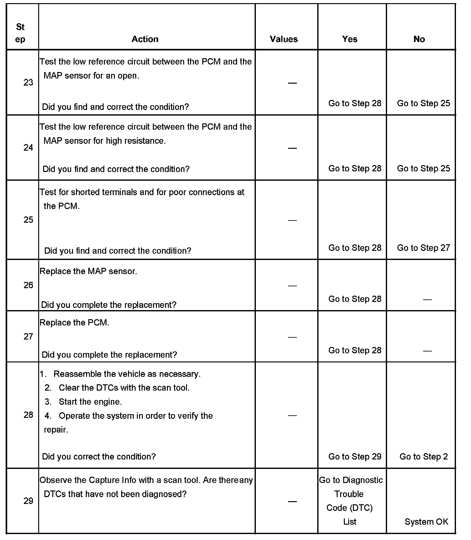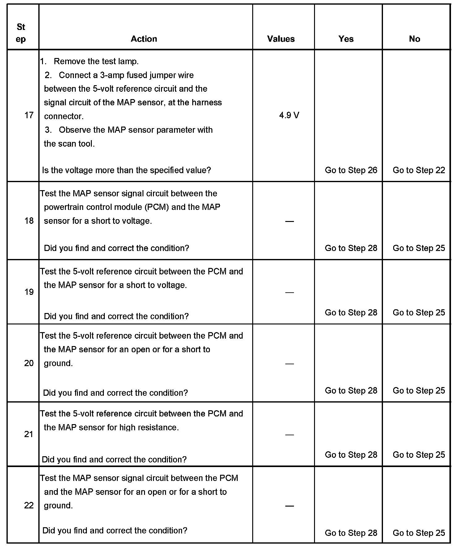 The manifold absolute pressure (MAP) sensor responds to changes in intake manifold pressure which gives an indication of the engine load. The MAP sensor has a 5-volt reference circuit, a low reference circuit, and a signal circuit. The powertrain control module (PCM) supplies 5 volts to the MAP sensor on the 5-volt reference circuit and provides a ground on the low reference circuit. The MAP sensor provides a signal to the PCM on the MAP sensor signal circuit, which is relative to the pressure changes in the manifold. With low MAP, such as during idle or deceleration, the PCM should detect a low MAP sensor signal voltage. With high MAP, such as ignition ON, engine OFF or wide open throttle (WOT), the PCM should detect a high MAP sensor signal voltage. The MAP sensor is also used in order to calculate the barometric pressure (BARO) when the ignition switch is turned ON, with the engine OFF. The BARO reading may also be updated whenever the engine is operated at WOT. The PCM monitors the MAP sensor signal for voltage outside of the normal range. If the PCM detects a MAP sensor signal voltage that is excessively low, DTC P0107 sets. If the PCM detects a MAP sensor signal voltage that is excessively high DTC P0108 sets.