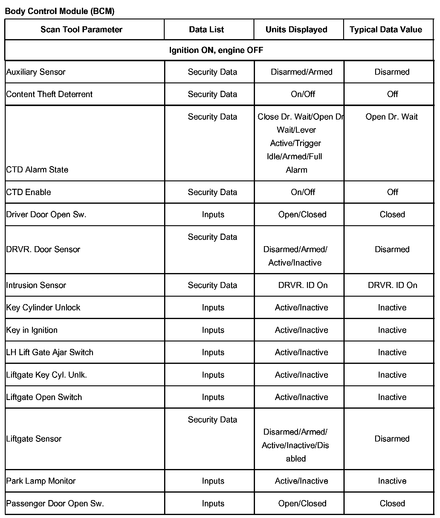 Scan Tool Data List - Body Control Module (BCM) - Part 1: