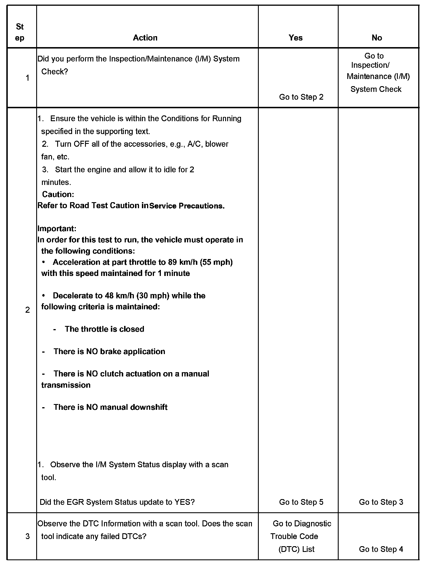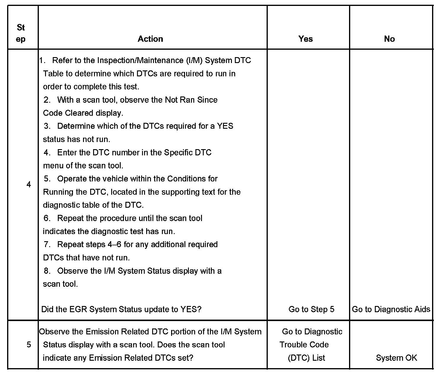 The purpose of this test is to satisfy the enable criteria necessary to execute inspection/maintenance (I/M) readiness diagnostics for the exhaust gas recirculation (EGR) system. The test may be used to set the I/M System Status indicators to YES. The I/M System Status display on the scan tool provides an indication of whether the control module has completed the required tests. The I/M System Status does not indicate that the tests have passed or failed. When all of the diagnostics for a specific system have run and passed, the I/M System Status will update to YES. If a test for a specific system has failed, the I/M System Status will update to YES, indicating a determination was made even if all of the other tests for that system have not run.