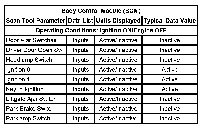 Scan Tool Data List - Body Control Module (BCM)