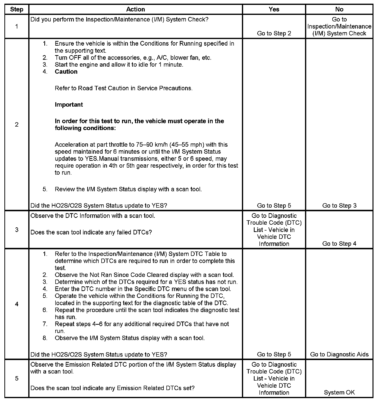 The purpose of this test is to satisfy the enable criteria necessary to execute inspection/maintenance (I/M) readiness diagnostics for the oxygen sensor (O2S, HO2S) system. The test may be used to set the I/M System Status to YES. The I/M System Status display on the scan tool provides an indication of whether the control module has completed the required tests. The I/M System Status does not indicate that the tests have passed or failed. When all of the diagnostics for a specific system have run and passed, the I/M System Status will update to YES. If a test for a specific system has failed, the I/M System Status will update to YES, indicating a determination was made, even if all of the other tests for that system have not run.