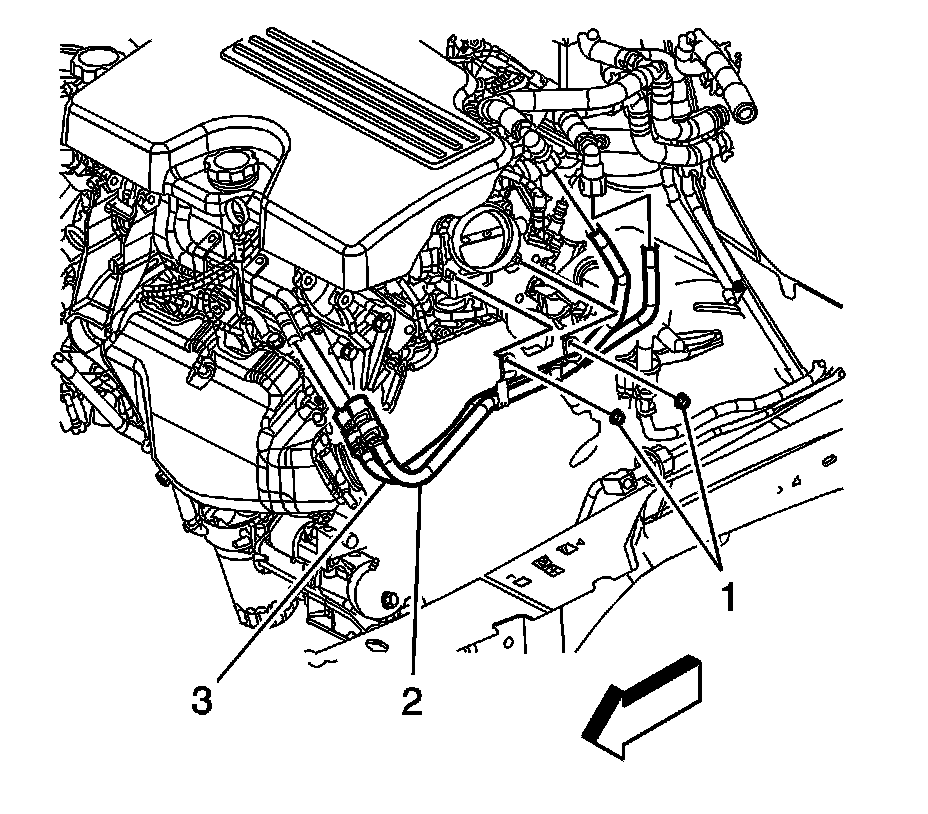14. Install the heater inlet and outlet pipe nuts (1) to the throttle body studs.