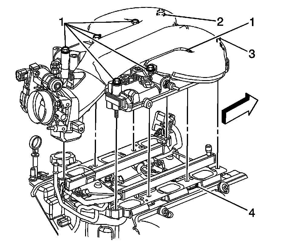 11. Apply threadlock GM P/N 12345382 (Canadian P/N 10953489) or equivalent, to the upper intake manifold bolts/stud threads.