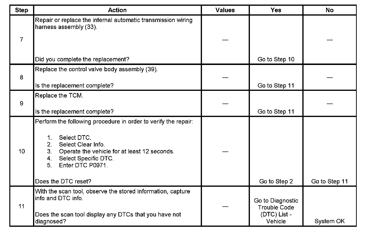 If the TCM detects a continuous short to voltage in the shift PC solenoid valve circuit, then DTC P0971 sets. DTC P0971 is a type A DTC.