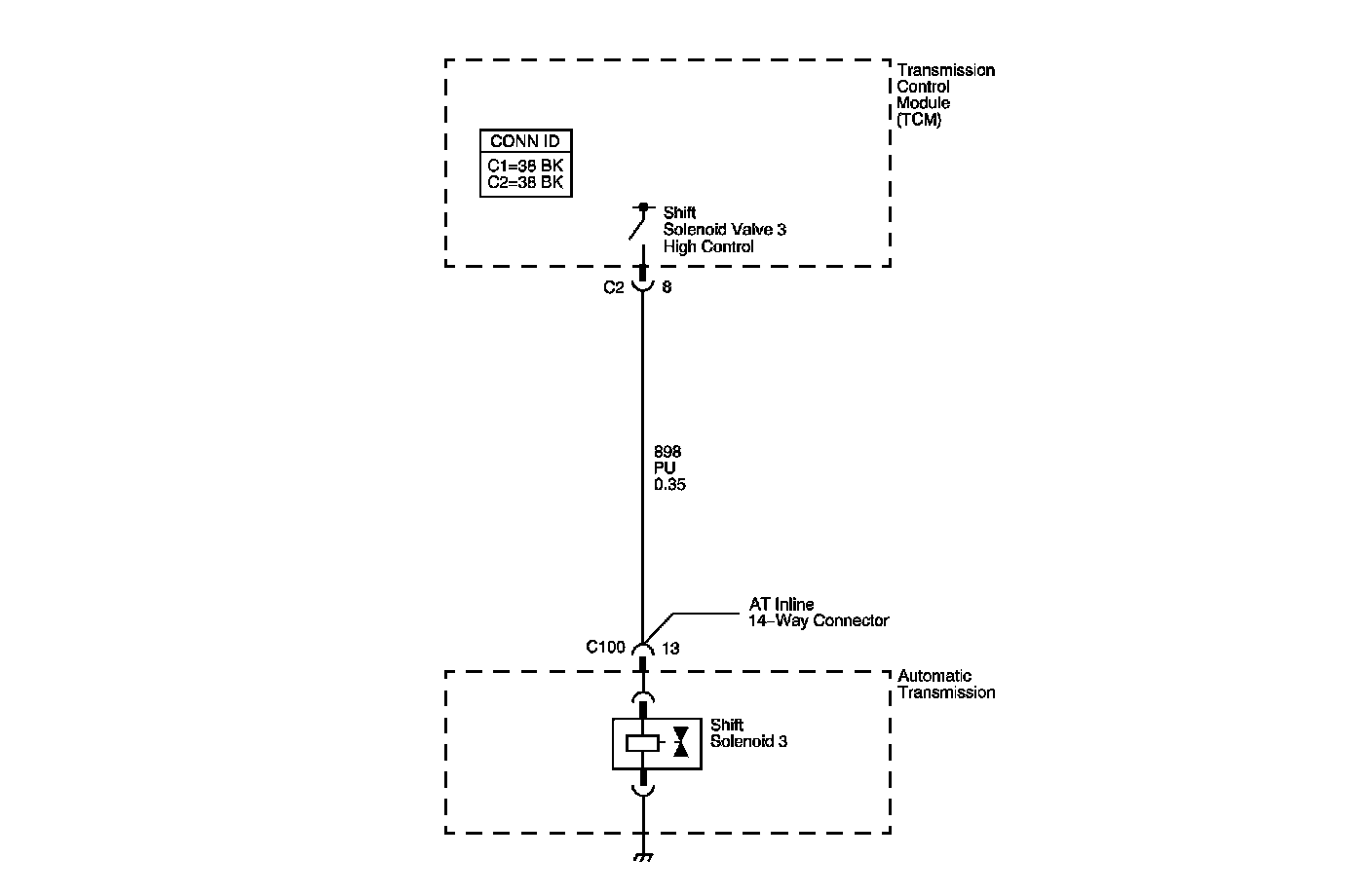 The 1-2, 2-3, reverse shift solenoid (SS) valve (S3) controls transmission fluid pressure acting on the U2 shift valve to position the valve for the appropriate gear. The 1-2, 2-3, reverse SS valve (S3) is a normally open exhaust valve located on the front control valve body. The solenoid is case grounded. The output driver module (ODM), within the transmission control module (TCM), commands the solenoid ON or OFF by providing voltage. When the 1-2, 2-3, reverse SS valve (S3) is commanded ON, the TCM senses high voltage. When the 1-2, 2-3, reverse SS valve (S3) is commanded OFF, the TCM senses low voltage.