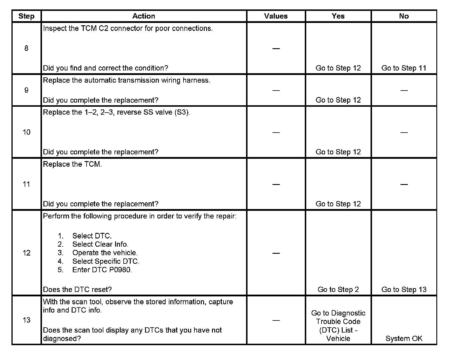 If the TCM detects a continuous open or short to voltage in the 1-2, 2-3, reverse SS valve (S3) circuit, then DTC P0980 sets. DTC P0980 is a type A DTC.