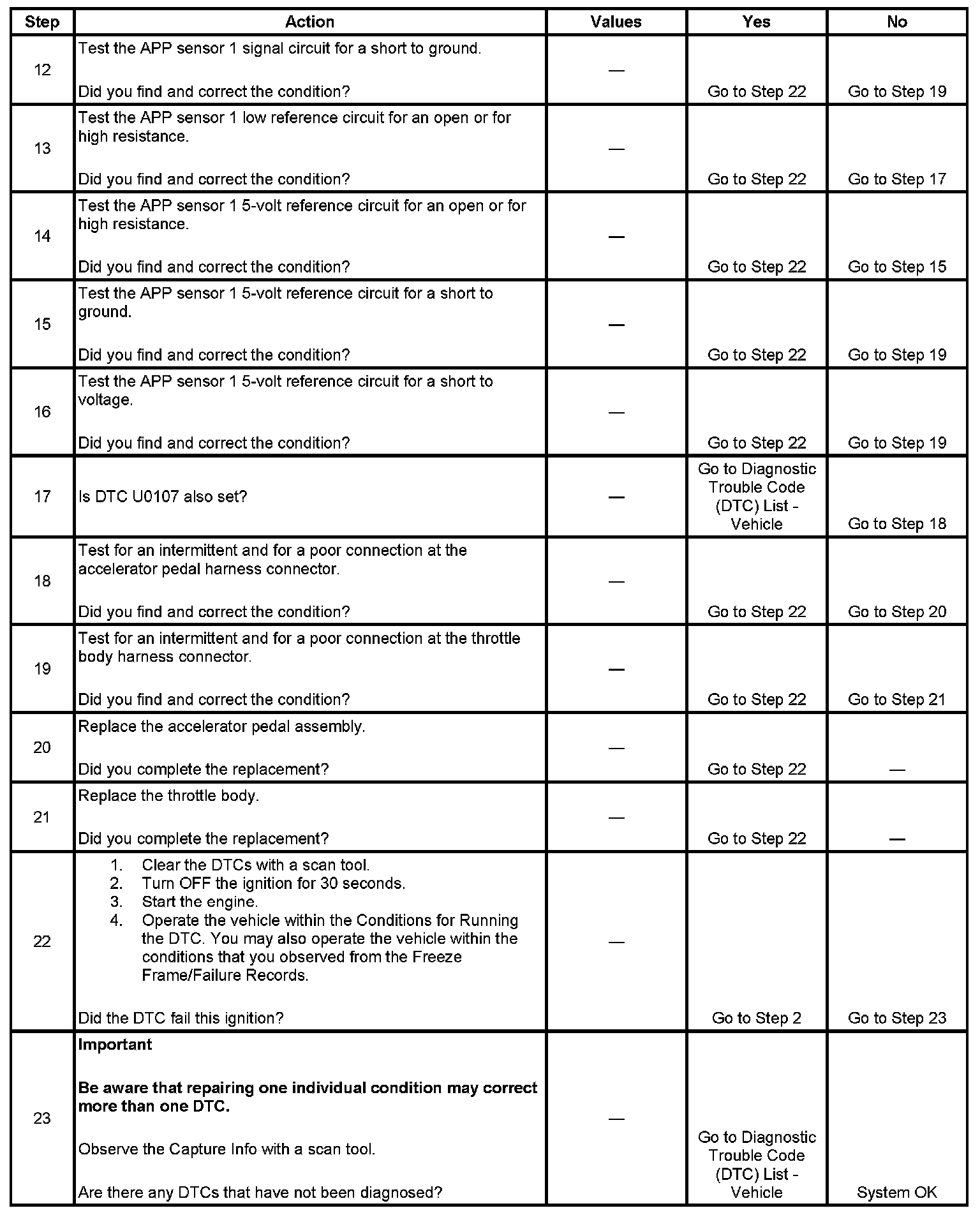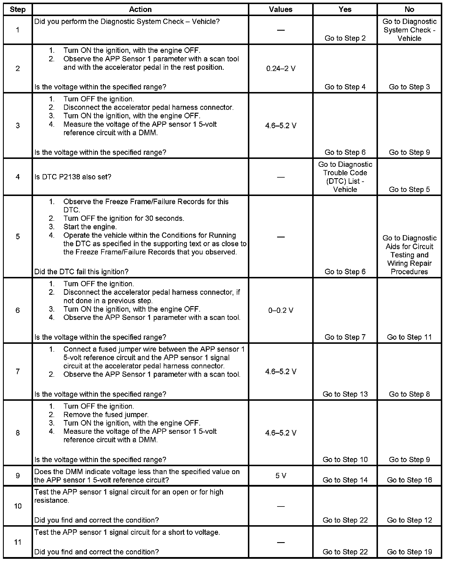 - The APP sensor 1 voltage is less than 0.235 volts for longer than 100 milliseconds when the accelerator pedal is at the closed throttle position.