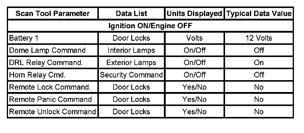 The Keyless Entry Scan Tool Data List contains all of the keyless entry related parameters that are available on the scan tool. The parameters in the list are arranged in alphabetical order. The column, "Data List," indicates the location of the parameter within the scan tool menu selections. Use the Keyless Entry Scan Tool Data List as directed by a diagnostic table or in order to supplement the diagnostic procedures. Begin all of the diagnostic procedures with Diagnostic System Check - Vehicle. Testing and Inspection