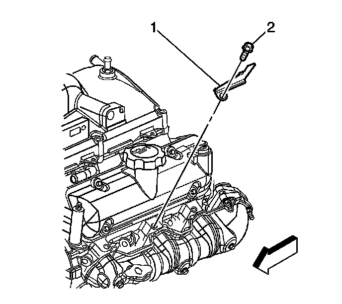 3. Remove the bolt (2) and the spark plug wire support (1).