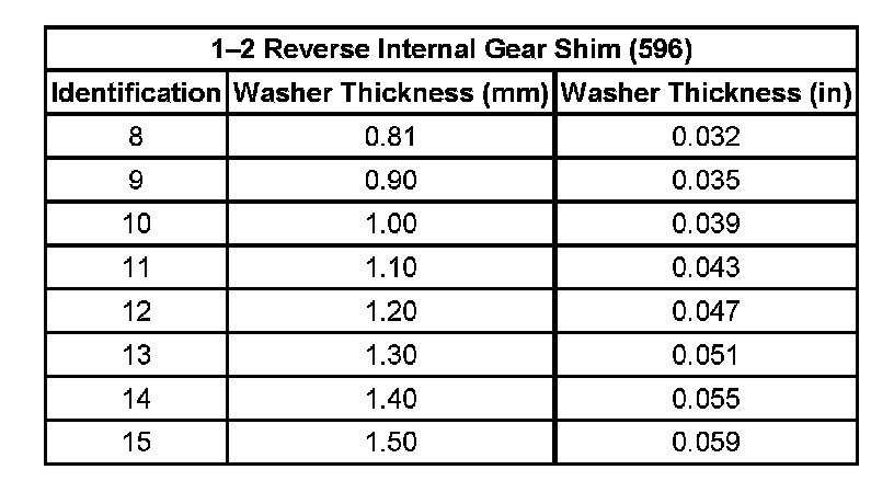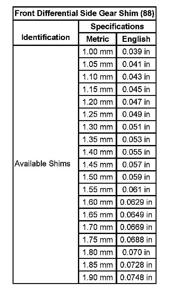 Shim Size Specifications Front Differential Side Gear Shim (88):