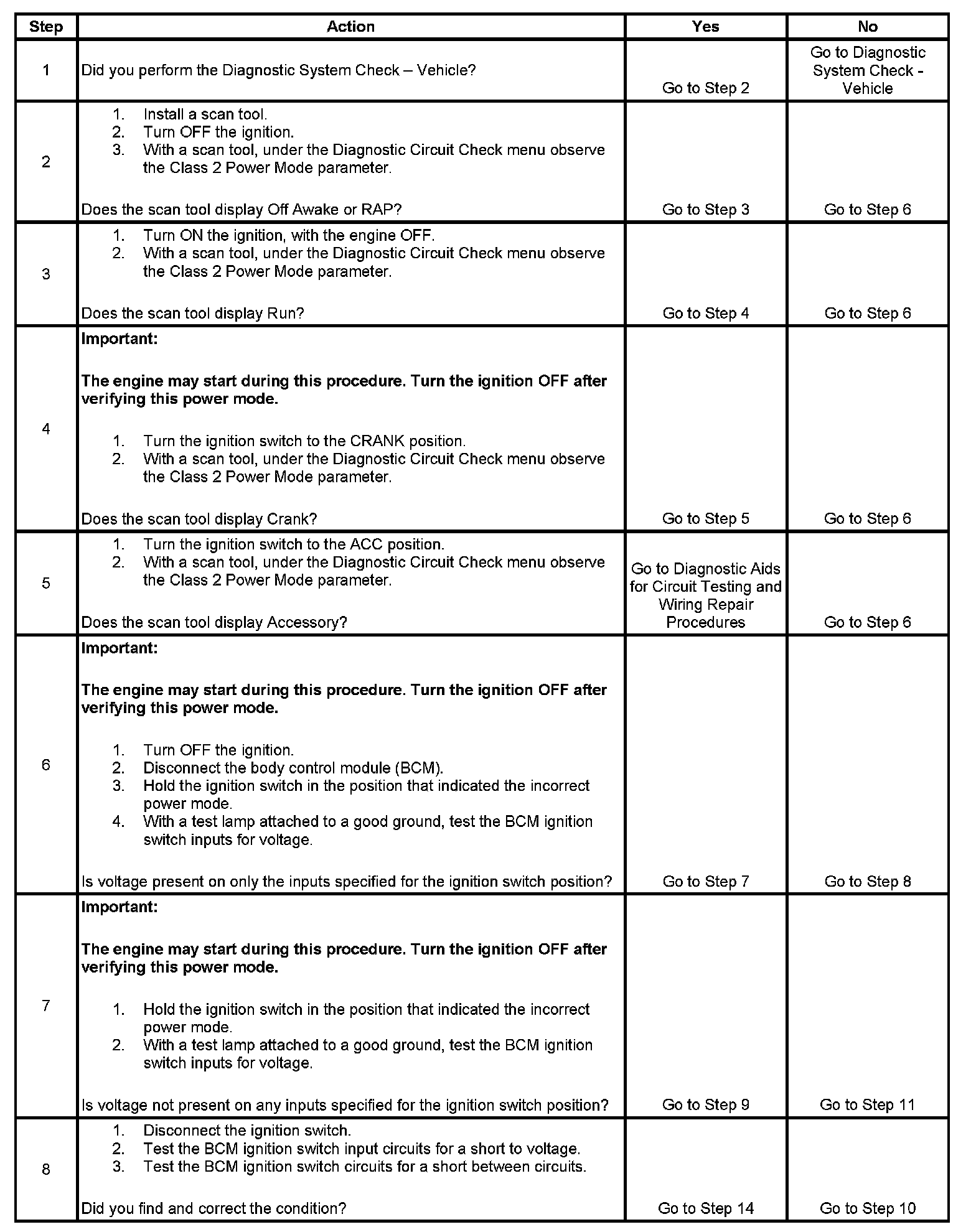 The body control module (BCM) is the power mode master responsible for sending the power mode message on the data buses. The BCM monitors Ignition 1 (Run/Crank), Ignition 2 (Acc/Run) and Ignition 3 (Run) signals from the ignition switch, and the engine run flag (ERF) in order to determine the present power mode. Refer to Body Control System Description and Operation for the applicable power mode look up table.