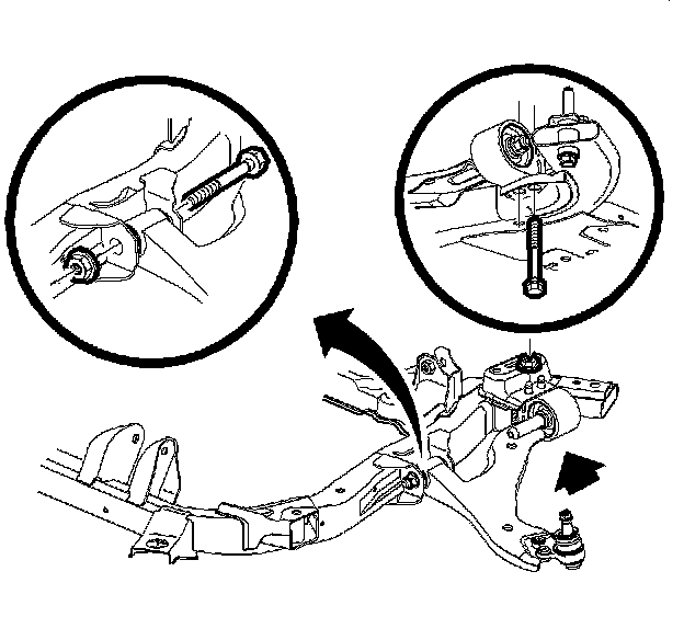 3. Install a new arm-to-frame front bolt and nut. Install new control arm-to-frame rear bolts and nuts.