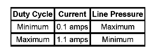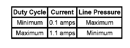 The TCM controls the line pressure control solenoid valve on a positive duty cycle at a fixed frequency of 292.5 Hz (cycles-per-second). A higher duty cycle provides a greater current flow through the solenoid. The high (positive) side of the line pressure control solenoid valve electrical circuit at the TCM controls the line pressure control solenoid valve operation. The TCM provides a ground path for the circuit, monitors average current and continuously varies the line pressure control solenoid valve duty cycle to maintain the correct average current flowing through the line pressure control solenoid valve.