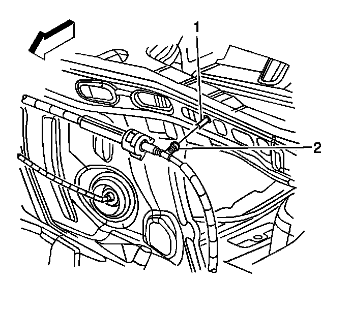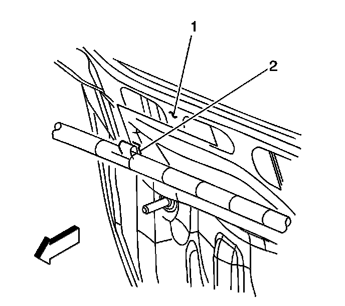 7. Install the shift control cable retainer (2) to the cowl stud (1) near the brake master cylinder.