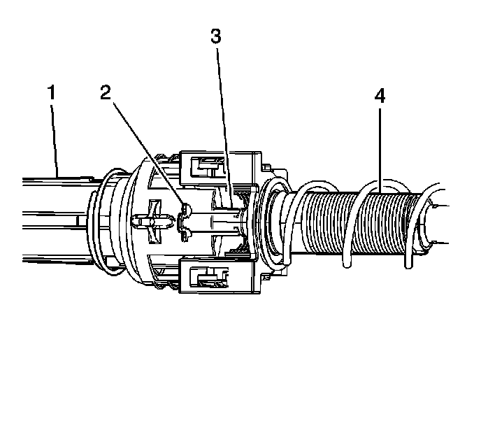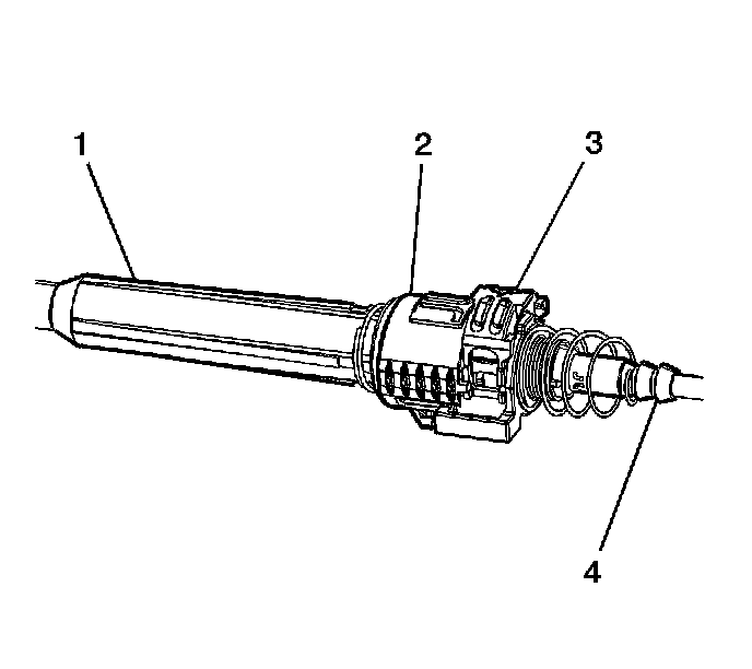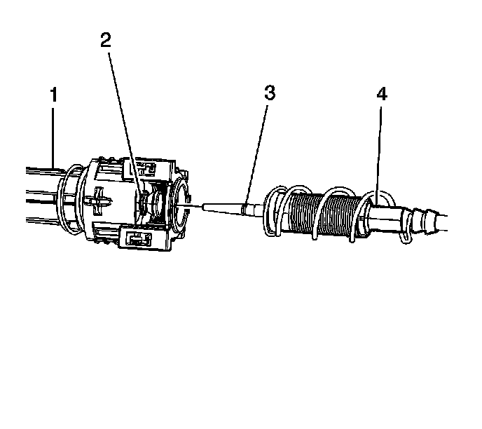 2. Push the transaxle end of the shift control cable (4) into the shift control end of the shift control cable (1) until the cable retaining clip (5) is fully locked into the shift control cable groove (3).