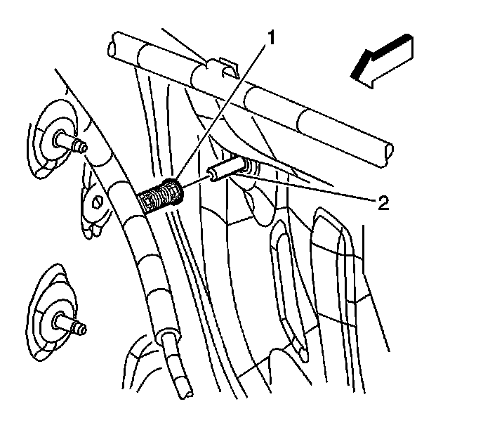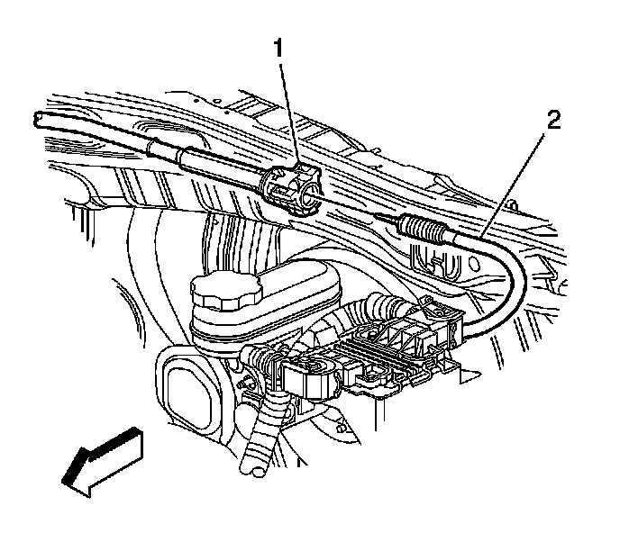 8. Separate the shift control end of the cable (1) from the transaxle end of the cable (2).