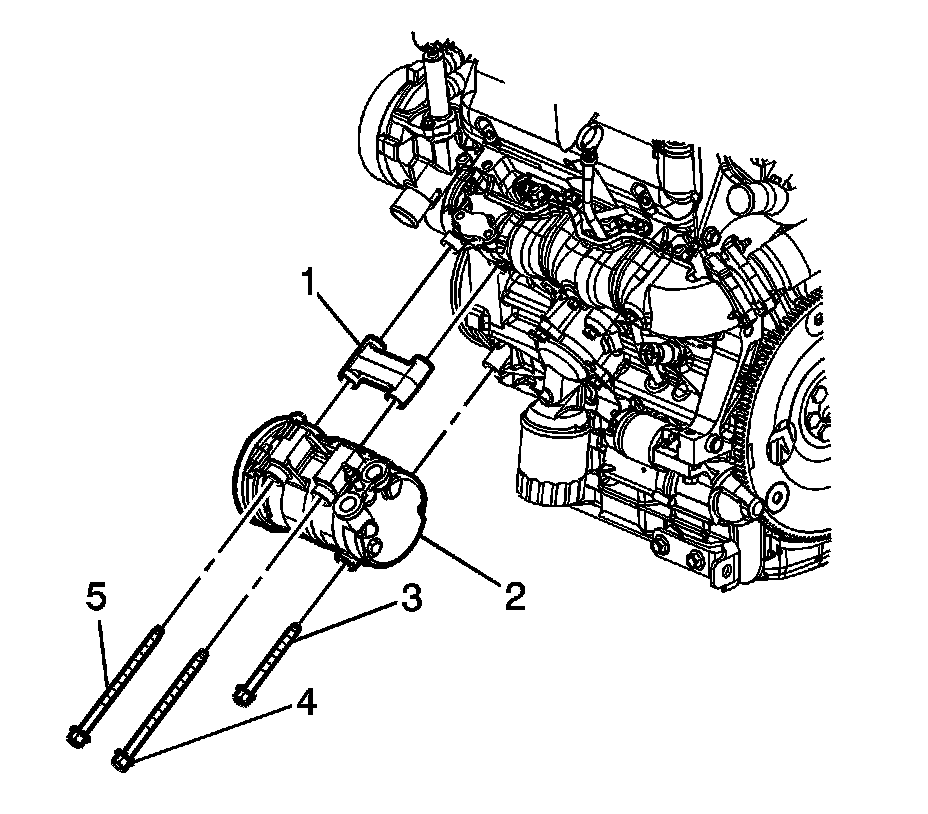 5. Install the compressor bolts to the compressor (2). Tighten the bolts in sequence.
