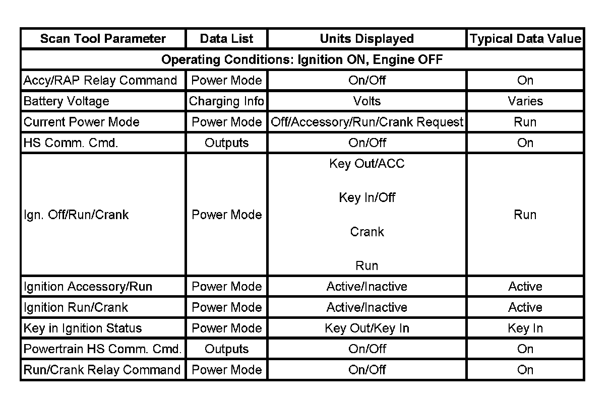 The scan tool data values were taken from a known good vehicle under the following conditions:
