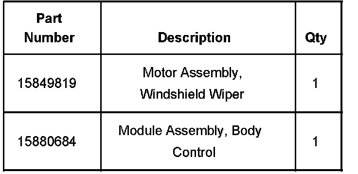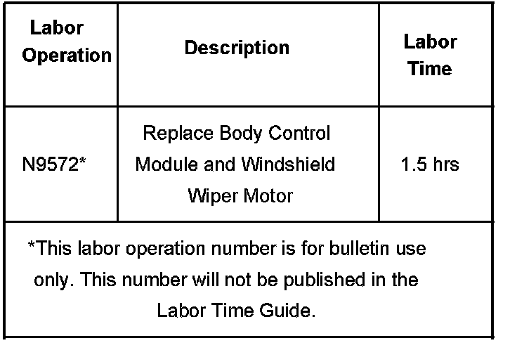 Technicians are to replace the BCM and the windshield wiper motor. Refer to the Body Control Module Replacement (SI Document ID # 1739665), Body Control Module Programming and Setup (SI Document ID # 1767502) and Windshield Wiper Motor Replacement (SI Document ID # 1725748) procedures in SI.