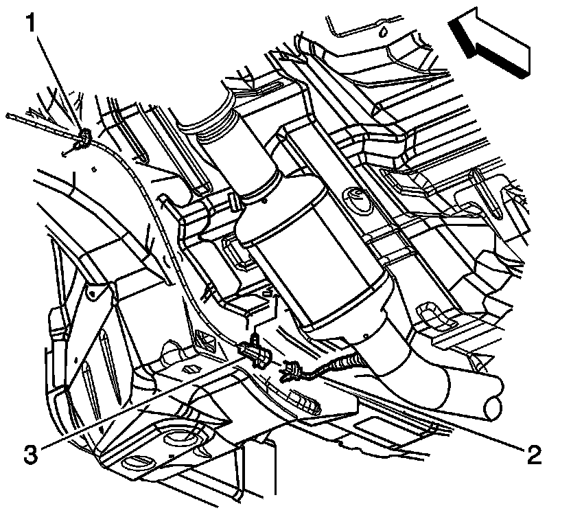 2. Disconnect the heated oxygen sensor (HO2S) connector (2) from the wiring harness (3).