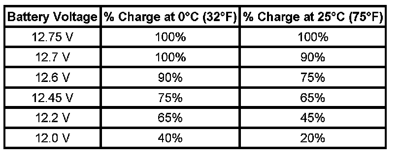 Important: Using voltage to determine the batteries state of charge (SOC) is only accurate after the battery has been at rest for 24 hours. This is enough time for the acid in each cell to equalize. If the battery has been charged or discharged in the past 24 hours, the battery SOC will only be an estimate.