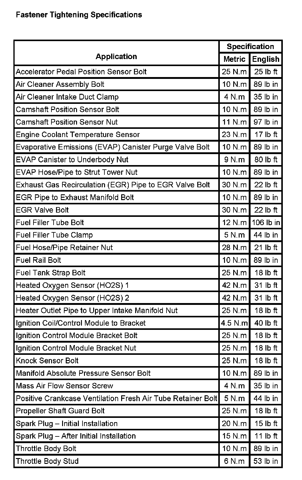Fastener Tightening Specifications: