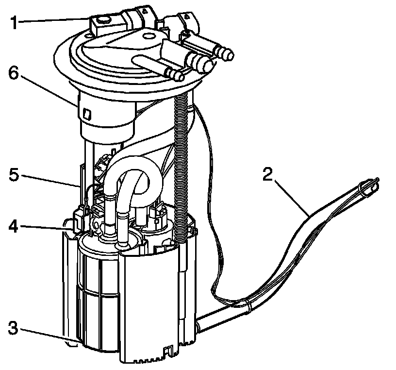 The fuel pump (2) is mounted in the primary fuel tank module reservoir. The fuel pump is an electric high-pressure pump. Fuel is pumped to the fuel injection system at a specified flow and pressure. The fuel pump delivers a constant flow of fuel to the engine even during low fuel conditions and aggressive vehicle maneuvers. The control module controls the electric fuel pump operation through a fuel pump relay.