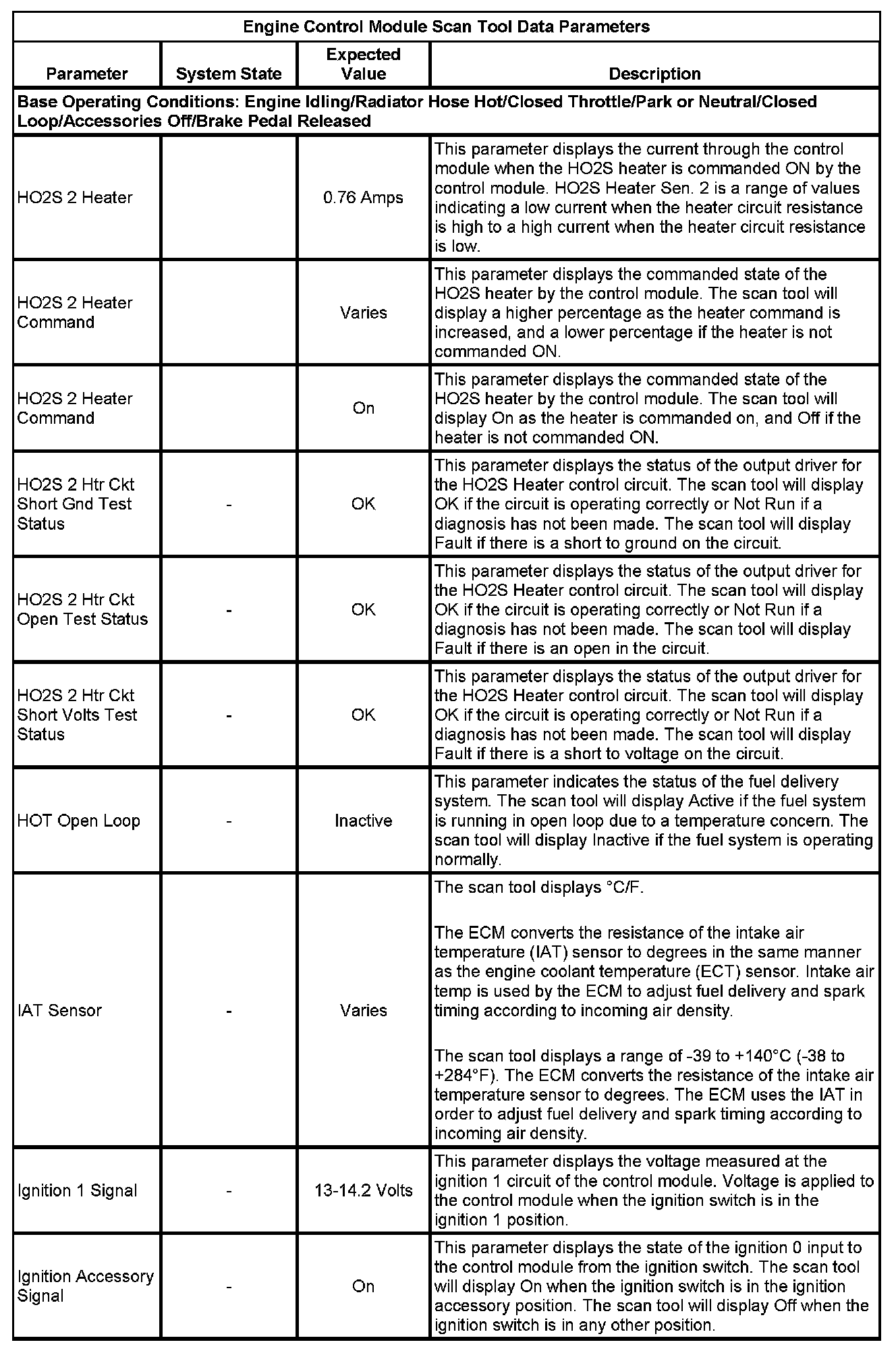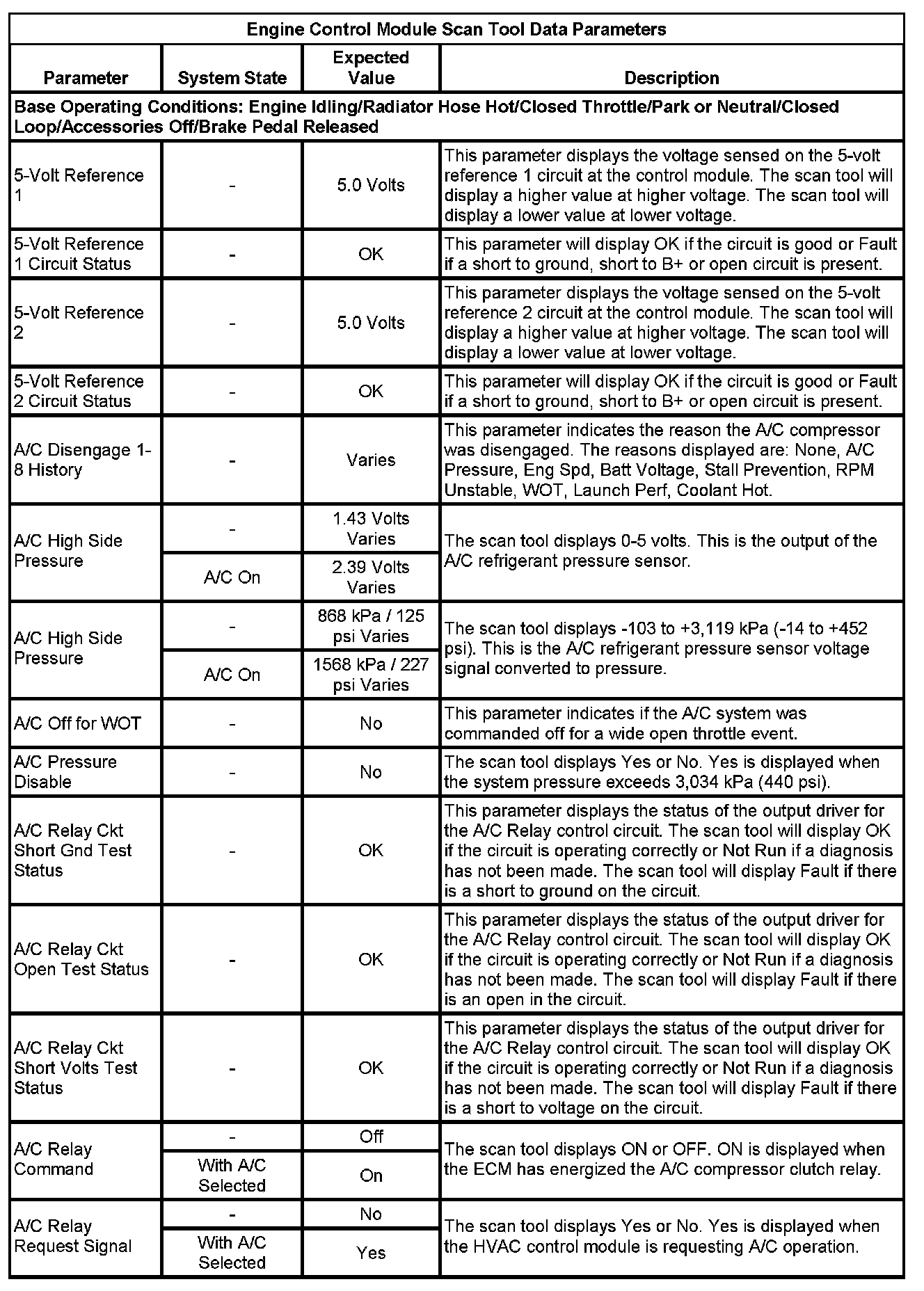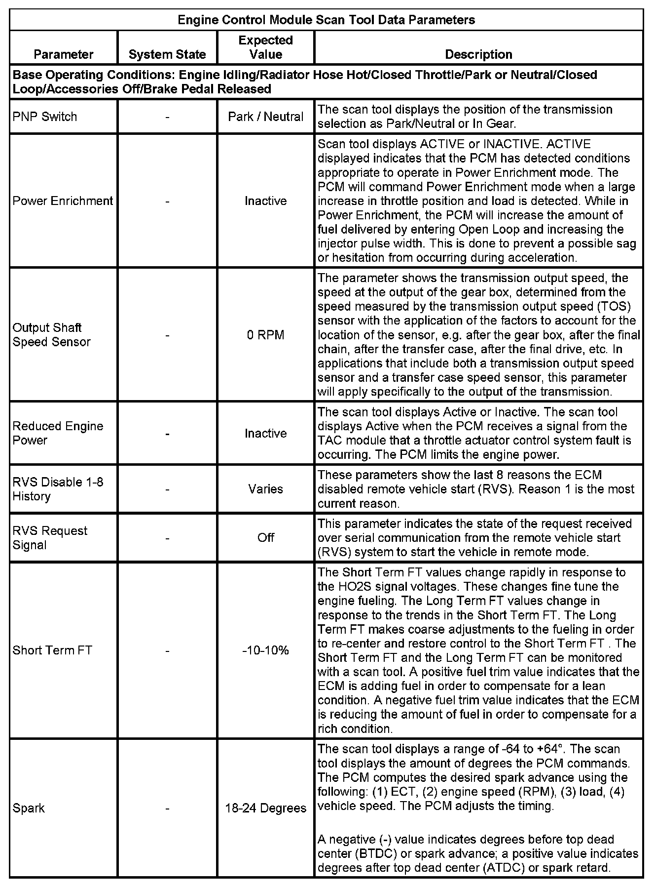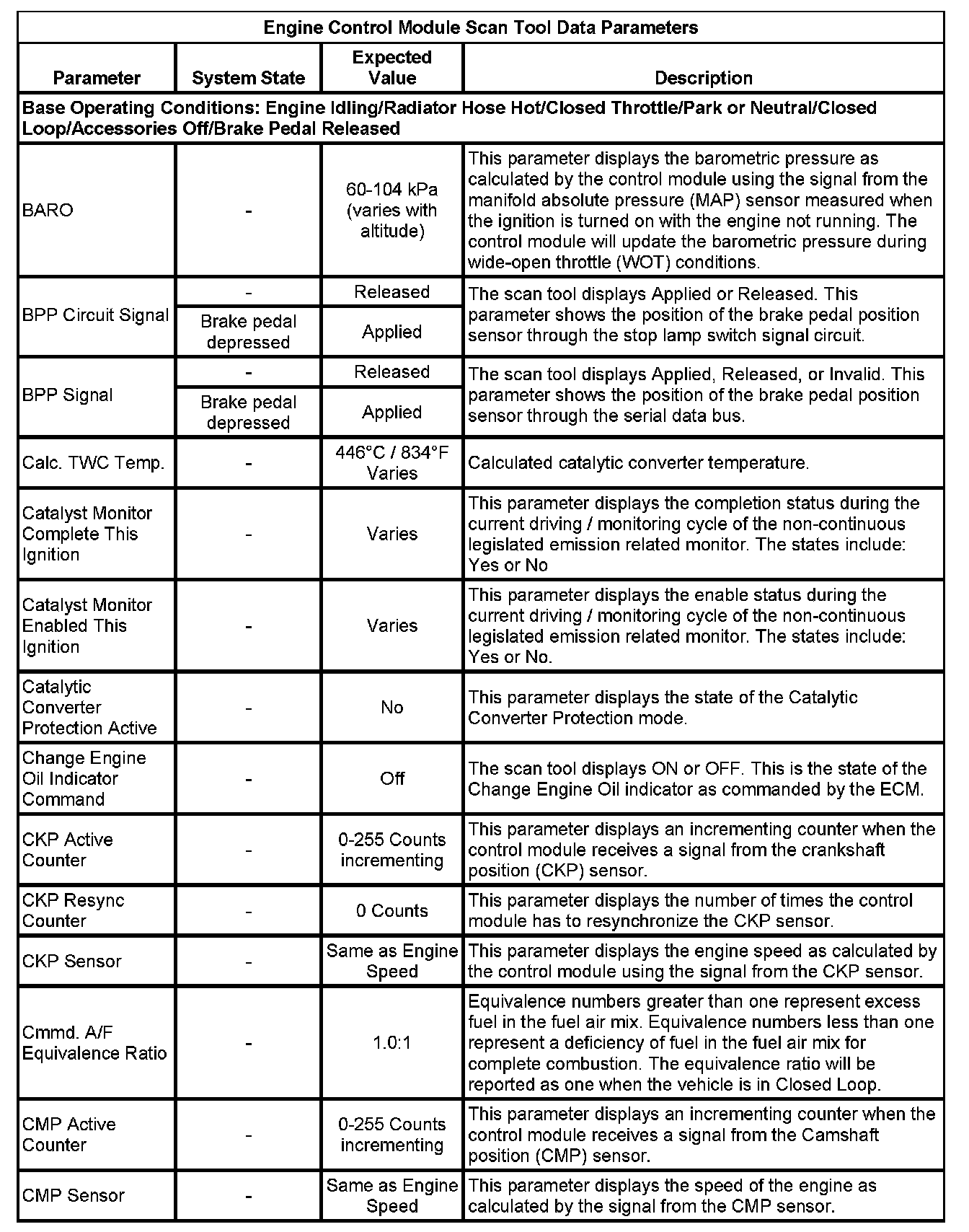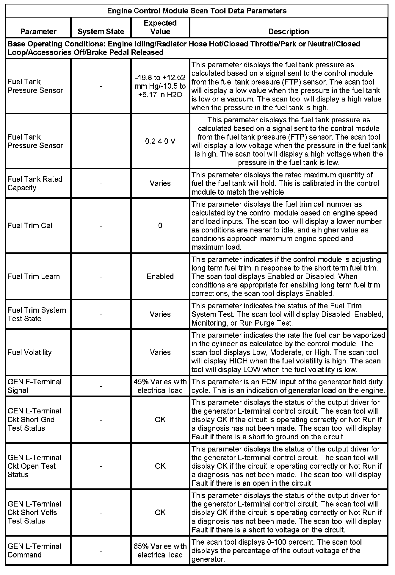 The Engine Control Module Scan Tool Data List contains all engine-related parameters that are available on the scan tool. The list is arranged in alphabetical order. A given parameter may appear in any one of the data lists, and in some cases may appear more than once, or in more than one data list in order to group certain related parameters together.