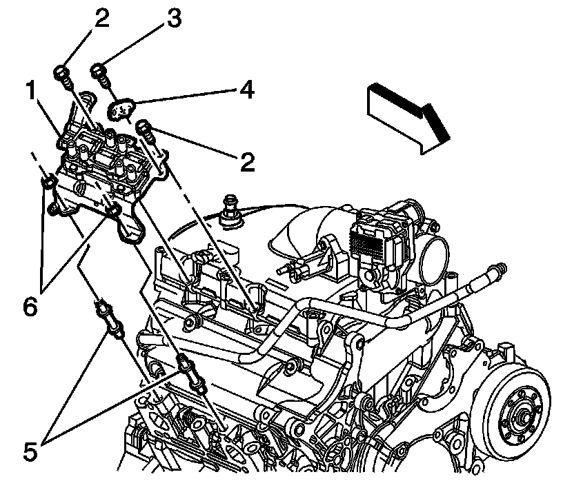 8. Remove the engine wire harness retainers from the ignition control module bracket studs (5).
