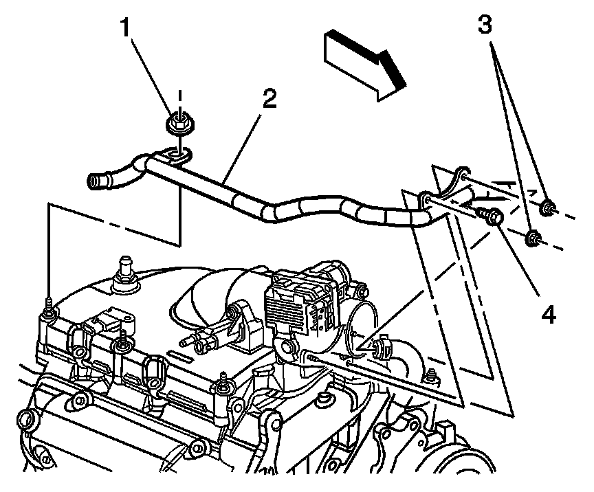 6. Install the bolt (3) from the fuel injector wire harness bracket (4) and PCV valve fresh air tube retainer.
